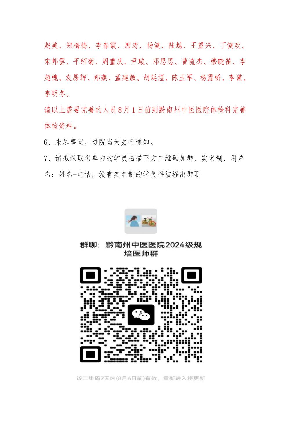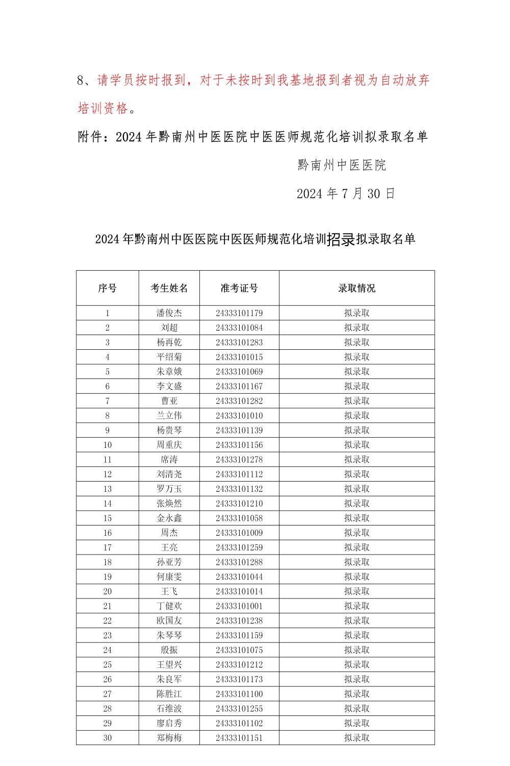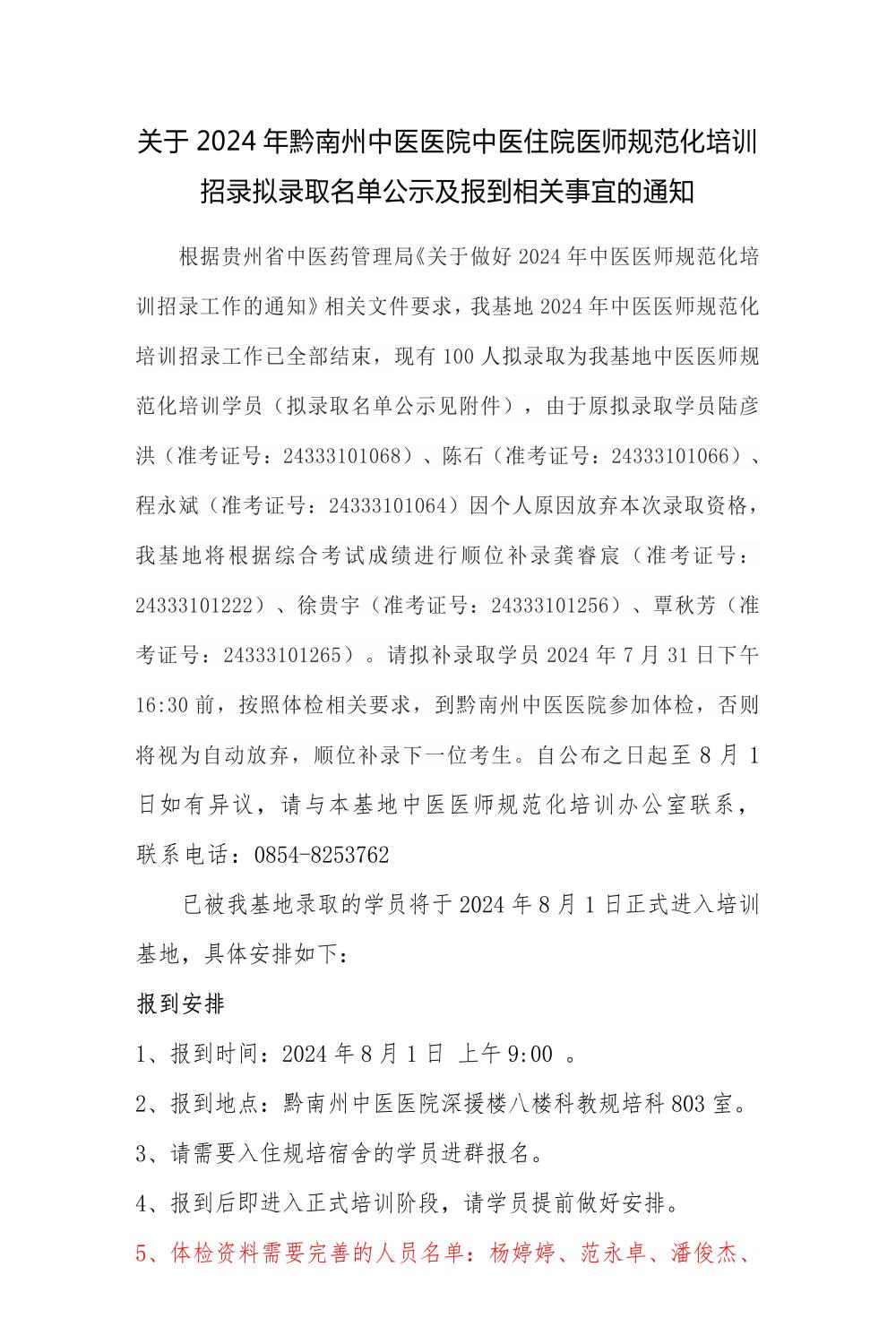 关于2024年黔南州中医医院中医住院医师规范化培训招录拟录取名单公示及报到相关事宜的通知
