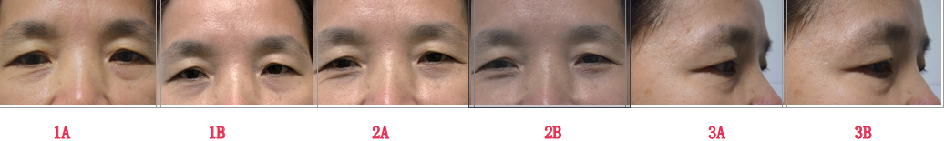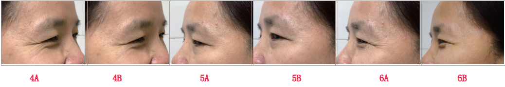 图为A型肉毒素联合点阵激光治疗后1个月后前后对比1A为治疗前正面静态;1B为治疗后1个月正面静态;2A为治疗前正面动态;2B为治疗后1个月正面动态;3A为治疗前右侧静态;3B为治疗后1个月右侧静态;4A为治疗前右侧动态;4B 为治疗后1个月右侧动态;5A位治疗前左侧静态;5B为治疗后左侧位静态;6A为治疗前左侧动态;6B为治疗后左侧动态。