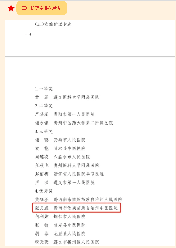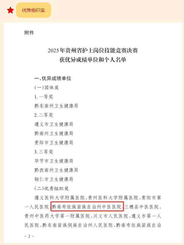 本次决赛中,贵州省共评选出13名优秀组织奖,黔南州中医医院总成绩全省排名第四,能够荣获此项殊荣,充分展现了我院护理领域的专业实力和团队协作精神。
