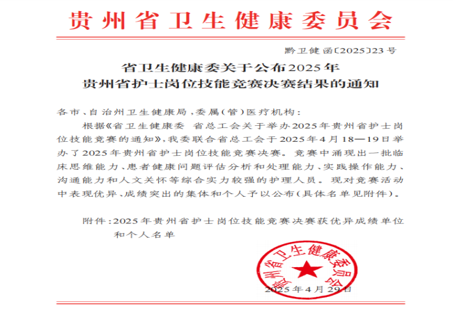 2025年4月18日至19日,贵州省卫生健康委员会携手贵州省总工会联合举办了“2025年贵州省护士岗位技能竞赛决赛”。黔南州中医医院成绩优异,荣获优秀组织奖1项,个人奖项4项。