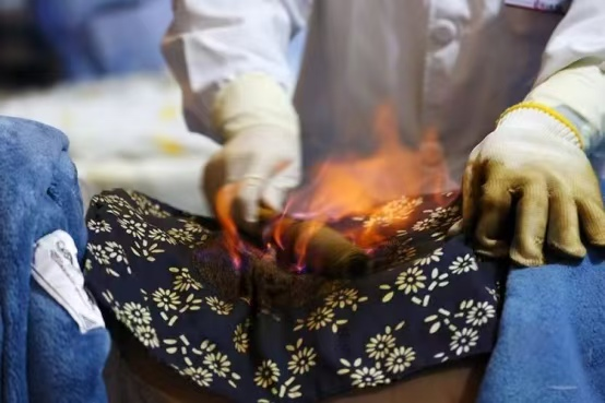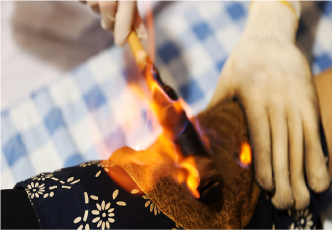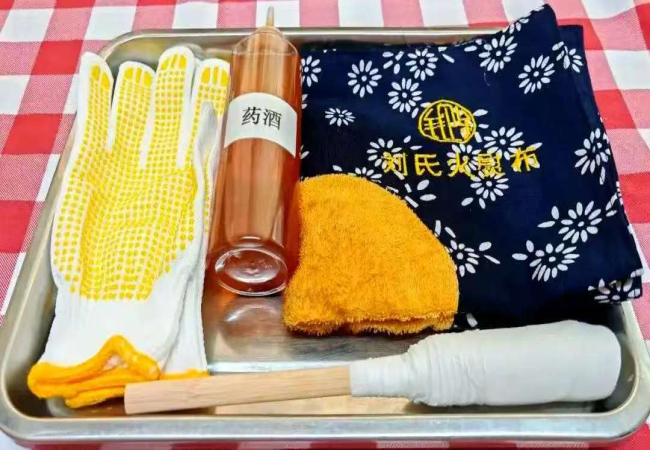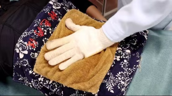 火熨术是一种具有历史渊源的中医外治法。该技术操作时,将特制的防火布放置于体表相应部位,将操作工具浸取药酒后点燃,在布面进行移动,通过产生的热力与药力共同作用于人体。