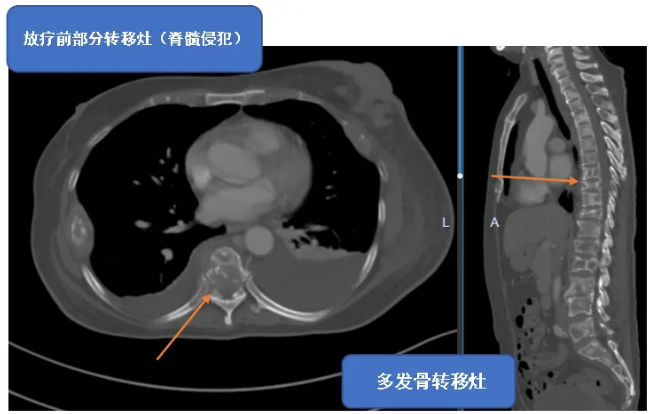 为了为患者争取生的机会,肿瘤科团队展开反复多次、多级医师参与的沟通,同时为患者进行专业的心理疏导,耐心讲解治疗方案的可行性与意义,逐步打消患者及家属的顾虑。最终,患者及家属松口,同意接受内分泌治疗,并对部分脊椎、脊髓转移灶进行姑息放疗以控制肿瘤,更期盼能通过放射治疗减轻癌痛,若肿瘤得到控制,患者或许能重新站立。