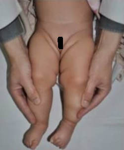 *双下肢不等长,外展试验阳性,关节及韧带过度松弛,臀位分娩婴儿;