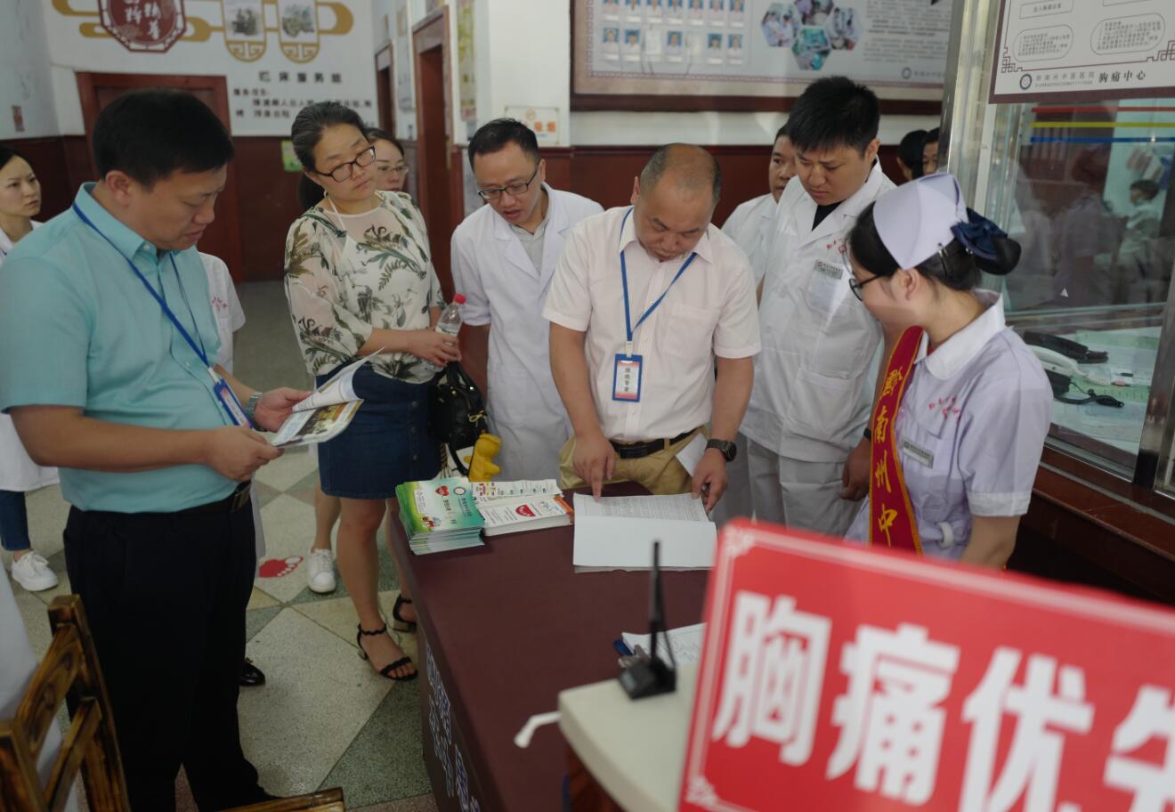 汇报结束后,专家组查阅了医院胸痛中心建设申报材料和数据库。随后,专家组走访了门诊、急诊科、心内科、导管室,现场考查了核心科室、收费处、保安等相关人员遇到胸痛患者的应对能力和处置流程,并实地查看了胸痛中心的标识、导向。