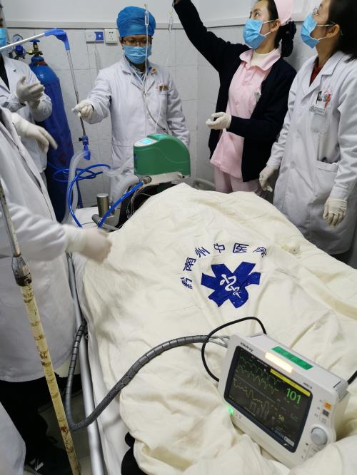 一位80多岁的心衰病人,大汗淋漓,突然神志不清,呼之不应……急诊科接到电话后,立即赶往事发地,发现患者心跳骤停,医生在急救车上立即进行心肺复苏,到达医院后,又立刻启动急诊抢救程序,成立抢救小组,在急诊科主任陈春花的指挥下,黄健华医师持续胸外按压,刘言医师立即给予患者气管插管、呼吸机辅助呼吸,护理人员同时开通静脉通路,遵医嘱静脉注射抢救药品,经过全体抢救小组医护人员十多分钟的积极抢救,病人恢复了呼吸心跳,恢复意识,安全转入重症监护室……