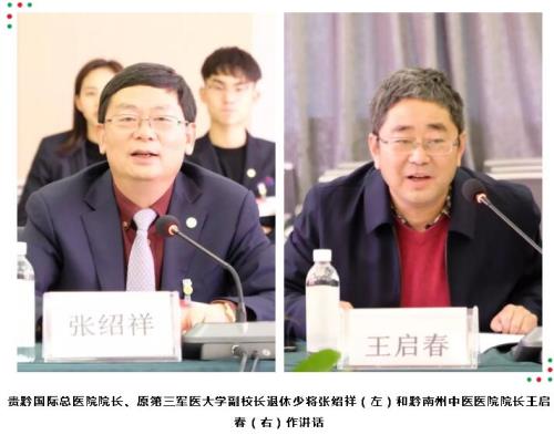 贵黔国际总医院院长、原第三军医大学副校长退休少将张绍祥和我院院长王启春分别就两院发展历程、学科优势、双向转诊、人才培养以及有待于进一步提高的各个方面做了详细阐述。他们认为,结合“不忘初心、牢记使命”的思想宗旨,两院应加强协作,整合资源,不断提升科研教学能力,共建百姓健康协作平台,同时不断创新发展思路,联合人才培养,共享医疗资源,盘活医疗、护理、管理人才,以多种合作模式为百姓提供全生命周期的健康服务。