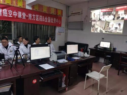 2020年1月8日19时,科室人员齐聚在医生办公室内,大家聚精会神地通过互联网收看实时直播……这不是在观看世界杯球赛,而是由南方医科大学牵头,深圳大学附属肿瘤医院、兰州大学附属医院、福建省肿瘤医院及我院等全国优秀胃癌肿瘤中心通过互联网联合协办高级腹腔镜胃癌空中课堂—视频交流研讨会。