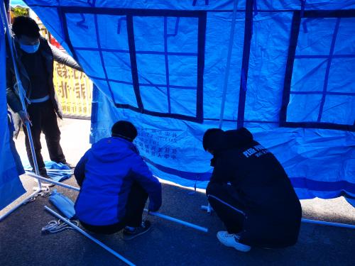 2020年1月23日上午9点,历时48小时,昼夜无休,总务基建科完成了场地平整、发热病区九间留观室及五间候诊帐篷的搭建及水、电、网全部通畅;并紧急请示市委、市政府协调,解决了一座移动卫生间,使各项设施、设置符合控感要求,创造了建设奇迹,确保了发热门诊正常投入使用。