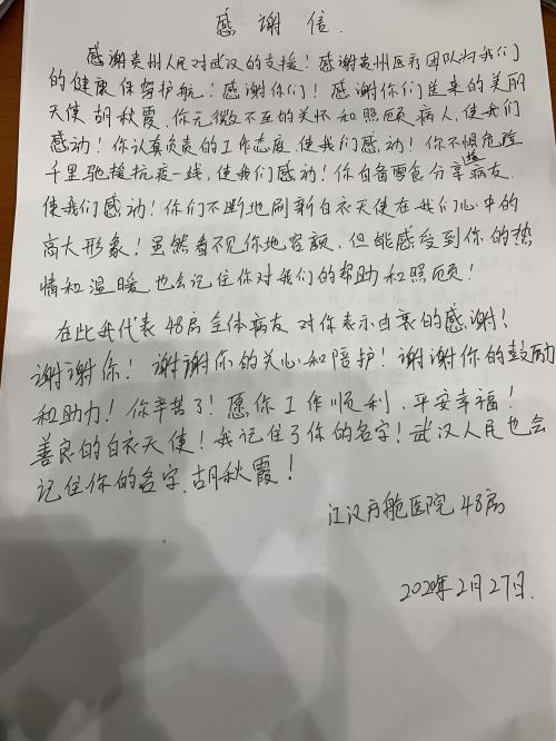 “感谢贵州人民对武汉的支持!感谢贵州医疗团队对我们的健康保驾护航!感谢你们!感谢你们给我们送来美丽的胡秋霞天使,你无微不至的关怀和照顾病人,使我们感动!……”这是2月27日早上,武汉方舱医院总台接到了一封来自患者的感谢信,信中点名表扬了黔南州赴武汉护理专业医疗队队员、州中医医院的胡秋霞。信里的字里行间流露出患者们对贵州援鄂医疗队和胡秋霞护士的感激之情,真挚的话语让人感受到温暖和欣喜。