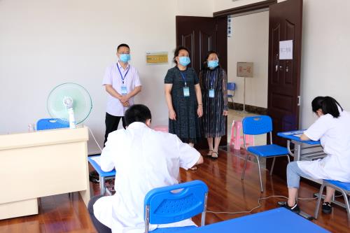 2020年国家医师资格实践技能考试(中医类)在黔南州中医医院考试基地如期进行,受到了我州卫健局的高度重视。7月14日,州卫生健康局党委委员王泓到考试基地视察工作。我院党委书记尹旺旭,党委委员、纪委书记李莉萍陪同视察。