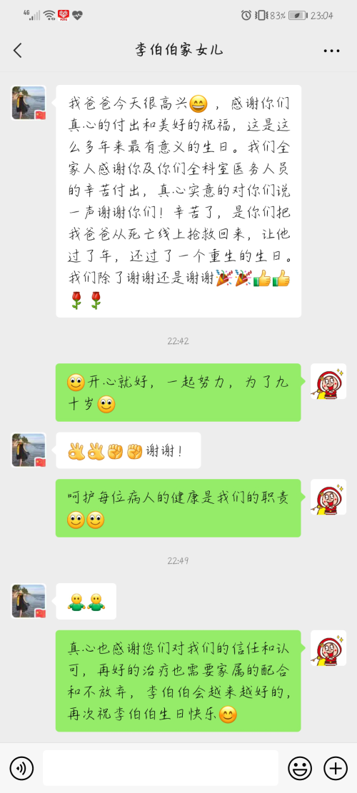 作为生命和健康的守护者,我们迎难而上!在李爷爷治疗期间,医护人员和家属一起,坚持不懈的守护、陪伴着李爷爷,鼓励他:“您要加油、不能放弃,要坚持坚持再坚持”。