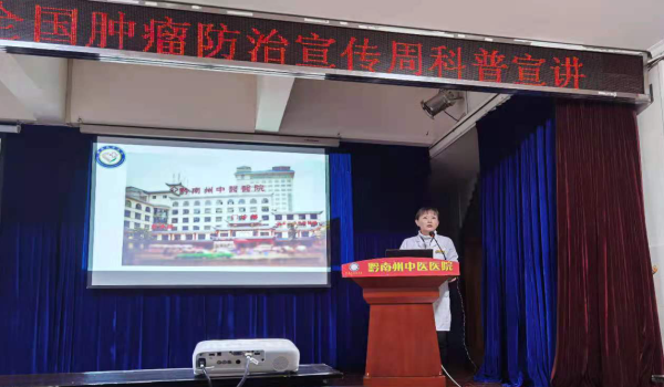 下午15:00-17:00在黔南州中医医院8楼会议室举行防癌科普讲座,全院医务人员参加学习。李亚娜副院长(主持工作)出席讲座并发表了讲话。她说,此次抗癌宣传周活动为群众带来了便捷的医疗服务,展示了科室的风采,也带动了全院的学术氛围发展,预祝活动取得圆满成功。讲座中,肿瘤科黄军主任通过《恶性肿瘤流行现状与防控对策》为大家展示了全球癌症现状,倡导大家改变不良生活方式,关爱自己和家人,关注癌症预防,定期体检筛查,做到早诊早治。肿瘤科孔祥应副主任在中医药层面给大家带来新的理解,展示中医防癌的理念:通过中医药扶正治疗及健康的生活方式,提高患者免疫力,使患者达到治愈或长期带瘤生存。