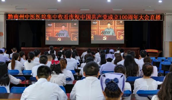 7月1日上午,庆祝中国共产党成立100周年大会在天安门广场隆重举行。黔南州中医医院领导班子成员、党员和干部共100人怀着无比激动的心情,集中收听收看了此次大会直播盛况,全院各党支部、各科室组织党员干部职工利用党员活动室等场所认真收看。壮观的天安门广场,一百响的礼炮,步伐铿锵有力的国旗护卫队,青少年们在天安门广场的庄严宣誓,习近平总书记满怀激情的讲话,现场的震撼透过电视荧幕传递到每位党员心中,大家无不感到热血沸腾,斗志昂扬。