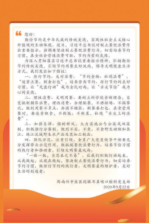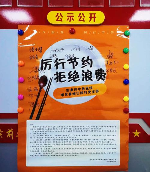 为深入贯彻落实习近平总书记对制止餐饮浪费行为作出的重要指示精神,同时也为积极响应院党委办公室近期提倡的“厉行节约,反对浪费”、“理性消费,文明用餐”、“加强自律,倡树新风”、“强化示范,注重引领”的良好行为规范,9月22日,黔南州中医医院眼耳鼻喉口腔科党支部开展“厉行节约,拒绝浪费”主题党日活动。