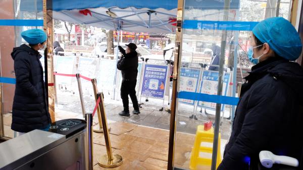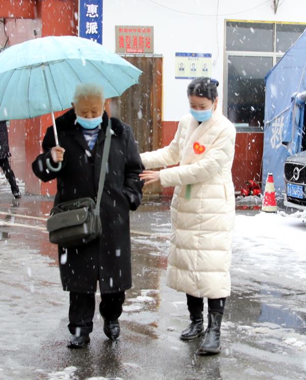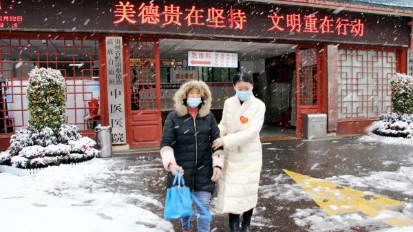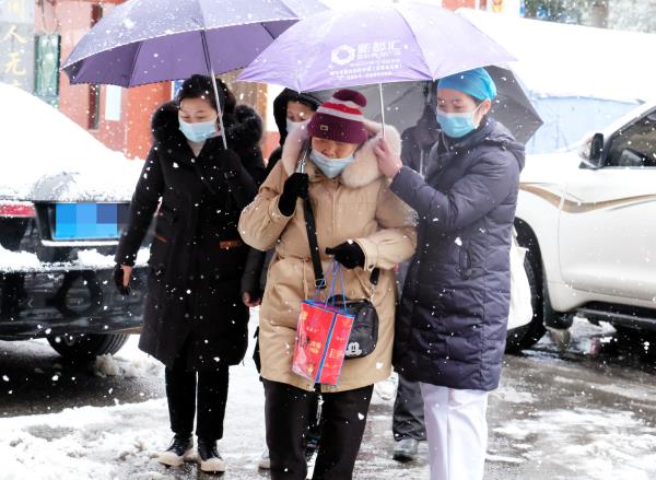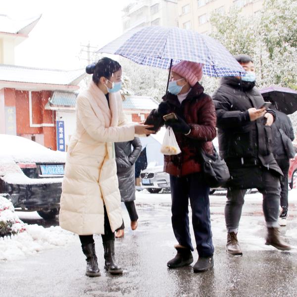 气温骤降,大雪纷飞,厚厚的积雪也使道路变得湿滑,给就诊的群众带来了不便。