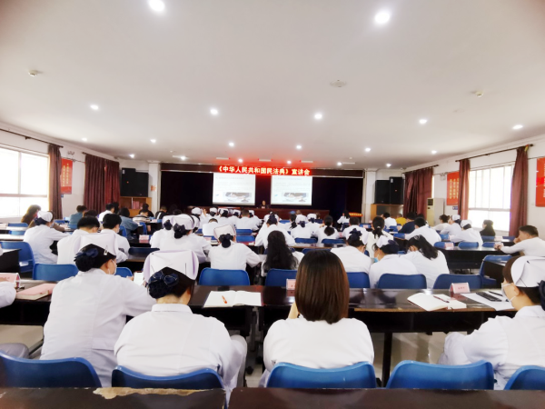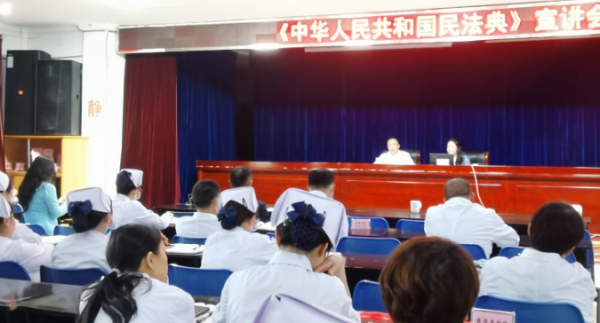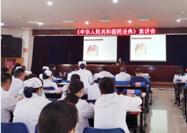 为深入学习宣传贯彻习近平法治思想,进一步提高全院干部职工法治意识,提升干部职工法治素养。2022年5月26日,我院邀请医院法律顾问在八楼会议室为全院干部职工开展《民法典》普法知识讲座。