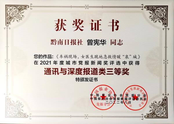 2023年2月,由我院宣传统战科提供新闻素材、《黔南日报》记者采写的《车祸现场,女医生跪地急救情暖“泉”城》一文,在2021年度城市党报新闻奖评选中获得通讯与深度报道类三等奖。该奖项于2023年2月,由中国报业协会党报分会颁发。