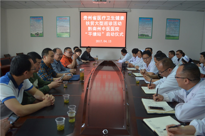 4月13日上午,贵州省医疗卫生健康扶贫大型巡诊活动“平塘站”启动仪式在平塘县人民医院拉开序幕,启动仪式上,我院领导专家首先听取了平塘县人民医院负者人的情况汇报,并在接下来的三天内对此次巡诊活动的流程进行了商讨,为提升基层医疗卫生服务能力,加深黔南州中医医院和平塘县的交流合作,帮助县医院医疗技术水平的提高和落实基层百姓的健康。
