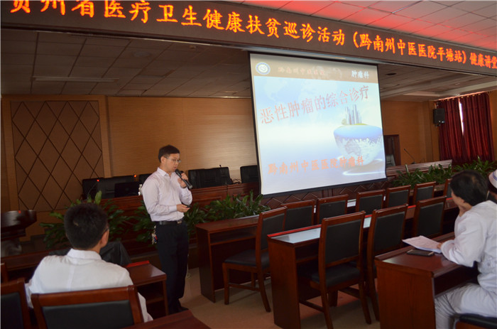 启动仪式结束后,首场健康讲堂在平塘县人民医院大会议室举行,由黔南州中医医院肿瘤科主任黄军为县医院全体医护人员作《恶性肿瘤的综合诊疗》学术讲座,此堂讲座进一步丰富了全体医护人员对恶性肿瘤等重大疾病诊疗的认识。