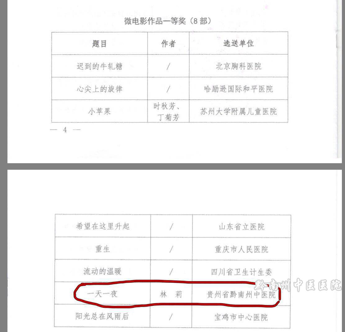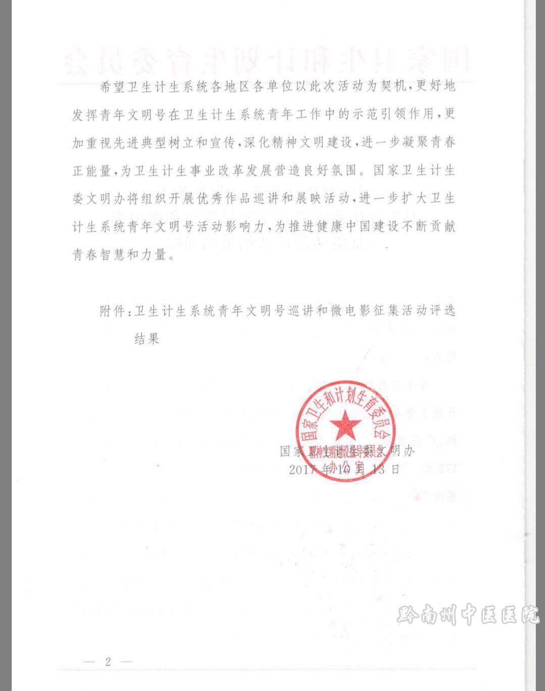2017年10月,经过评选专家组历时半年的优中选优,专业评审并报国家卫生计生委直属机关党委同意,我院微电影《一天一夜》在国家卫生计生委文明办主办的“全国卫生计生系统青年文明号巡讲和微电影征集活动评选”中,荣获微电影类作品一等奖。