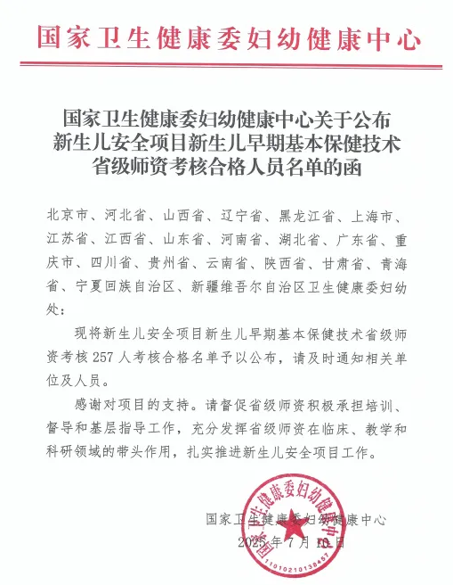 近日,从国家卫生健康委传来喜讯,我院邓薇同志在新生儿早期基本保健技术(EENC)省级师资考核中表现优异,成功通过认证,目前成为黔南布依族苗族自治州首位且唯一获此资质的专业技术人员!这一荣誉不仅是对邓薇同志个人专业能力的充分肯定,更为我州新生儿保健领域注入了专业师资力量,对提升区域新生儿保健服务质量具有里程碑式的意义。