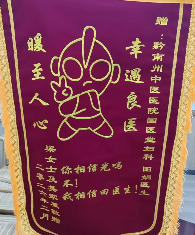 当奥特曼的卡通形象跃然锦旗之上,搭配着俏皮又真挚的配文——“你相信光吗?不,我相信田医生”,这份独属于年轻人的感谢,像一束暖光,瞬间照亮了黔南州中医医院国医堂整个科室,也温暖了每一位医护人员的心。这面看似“可爱”的锦旗背后,藏着一位26岁妈妈跨越两年的求子艰辛,更镌刻着中西医结合诊疗创造的暖心奇迹。