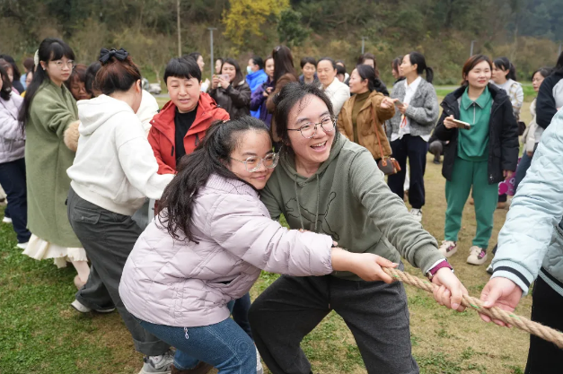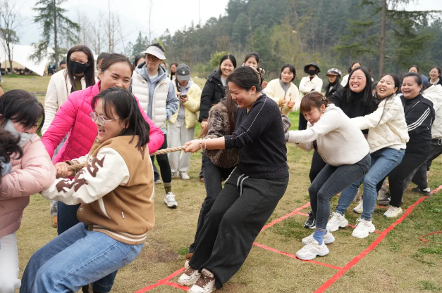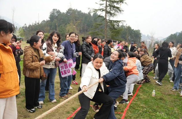 随后,拔河比赛将整个活动氛围推向高潮。8支参赛代表队精神抖擞、士气高昂,队员们迅速站位、紧握长绳,眼神坚定、斗志昂扬。随着一声令下,大家同心协力、奋力拼搏,脚蹬地面、身体后倾,使出浑身力气争夺胜利;场下啦啦队员们呐喊助威、掌声不断,“加油”声、欢呼声此起彼伏,响彻山间,充分彰显了全院女职工凝心聚力、奋勇争先、团结协作的团队精神,赛场之上,每一份坚持都值得喝彩,每一次协作都温暖人心,处处洋溢着团结奋进、欢乐祥和的节日氛围。