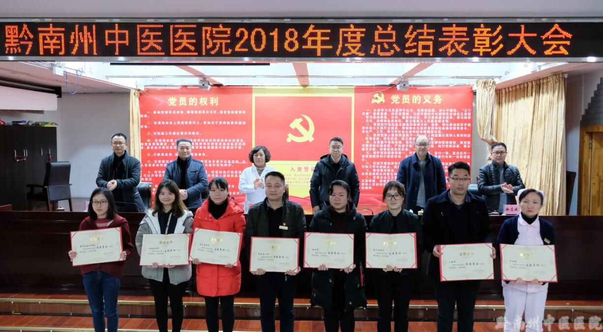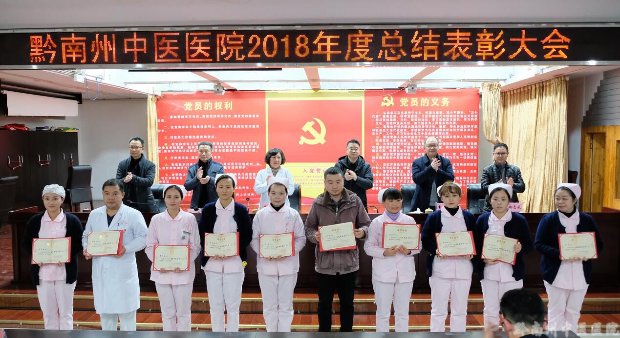 为更好的树立榜样的力量,院党委决定对18个先进集体,138名先进工作者、20名优秀带教老师、4名优秀师承指导老师、10名优秀住培学员以及荣获“2018年度病历质量奖”“ 临床路径管理先进集体”、优秀路径管理员”的集体和个人进行表彰。表彰会上,党委副书记、纪委书记尹旺旭同志宣读了表彰决定,并希望广大职工能以先进为标杆,严于律己,不断提高自身政治和业务水平,锐意进取,开拓创新,向先进看齐,主动适应新形势、新要求,坚持以习近平新时代中国特色社会主义思想为指导,牢固树立“四个意识”,坚定“四个自信”,做到“四个服从”,不忘初心、牢记使命,感恩奋进,共同努力为开创黔南州中医医院改革发展新局面而奋斗。