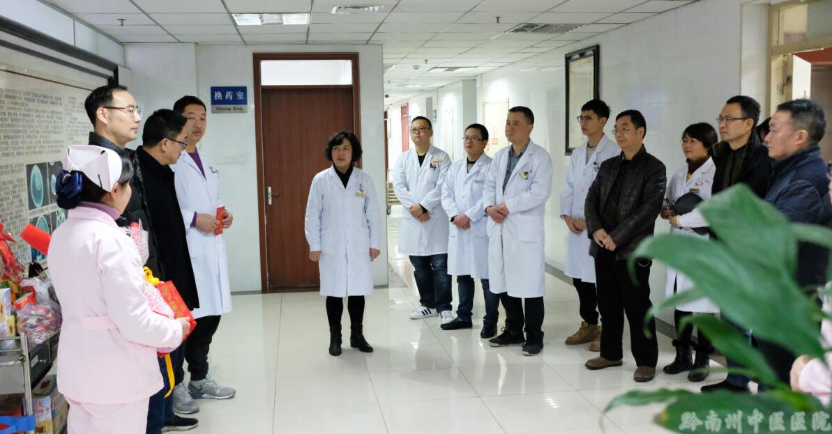 临近春节,美丽的桥城到处洋溢着年的味道。2月1日,黔南州卫健局党委委员刘胜军,州卫健局党委委员、副局长王先坤一行4人,来到我院慰问临床一线的医务工作者和住院的患者,提前向他们送上暖意融融的新年祝福和慰问品。