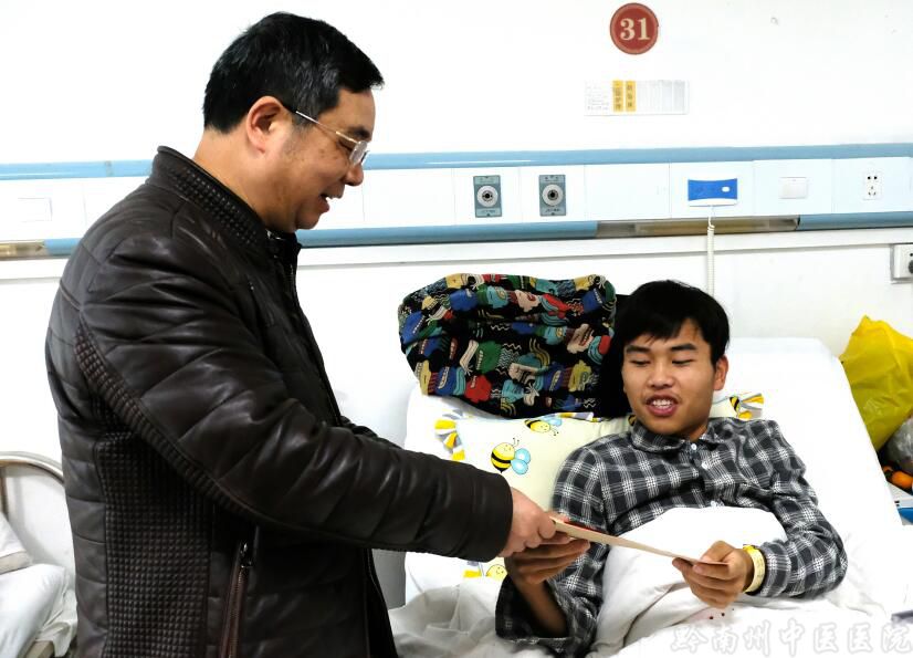 病房内院领导详细询问了陆广文的身体状况,治疗恢复情况,鼓励他要坚定战胜疾病的信心,配合治疗,保持乐观的生活态度。在了解到陆广文是一名大学生后院领导勉励他在今后的大学生活中继续发扬艰苦朴素、勤奋好学的精神,用所学的知识充实自己、改变家庭、改变人生,早日成为社会栋梁之才。要心存感恩,把党和政府的关怀和社会各界的关爱转化为自强不息、立志成才的强大动力。