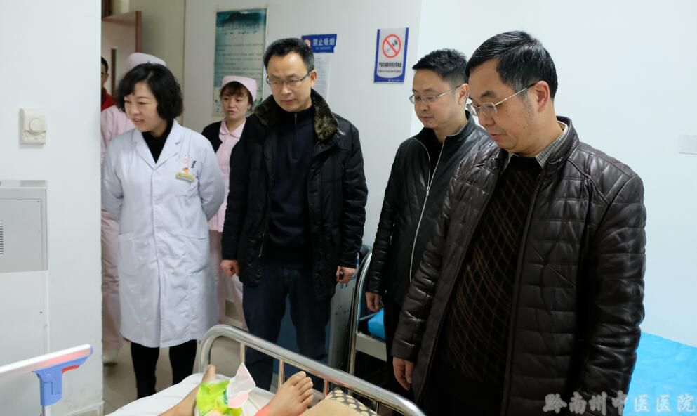 春节将至,我院领导杨建平、常智玲、尹旺旭、李浩来到病房里看望慰问医院扶贫点平塘县掌布镇掌布村的贫困户陆广文,并送去2千元钱慰问金。